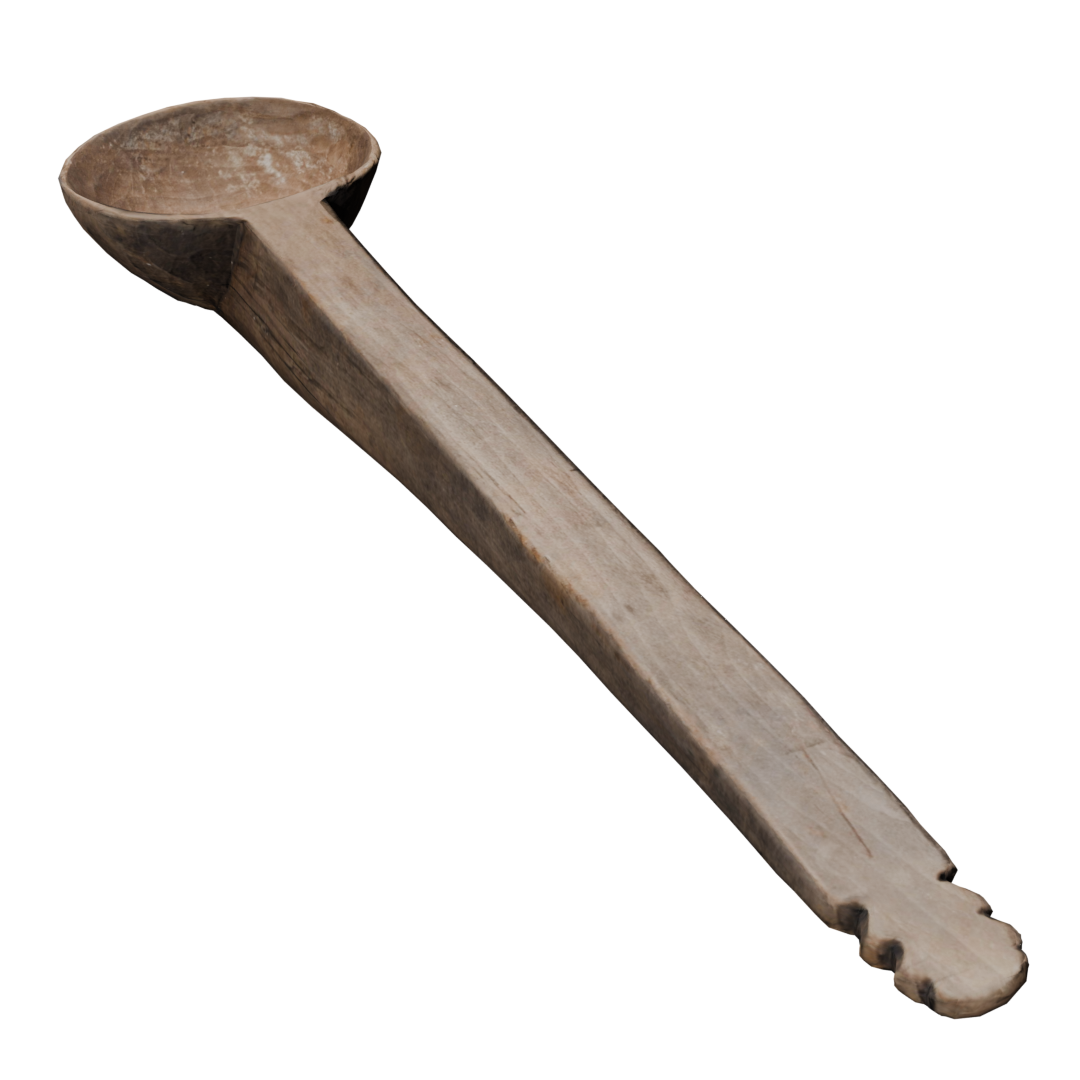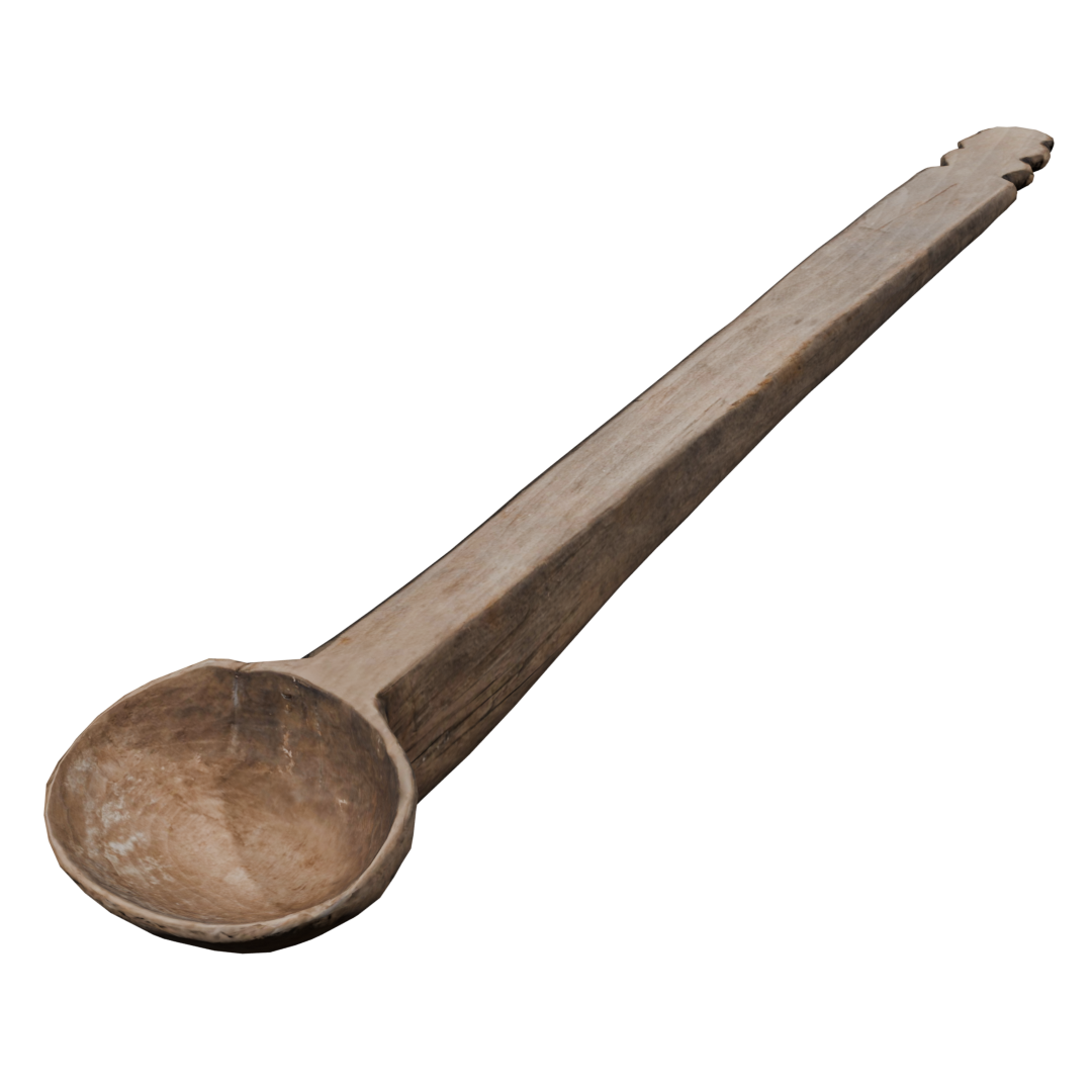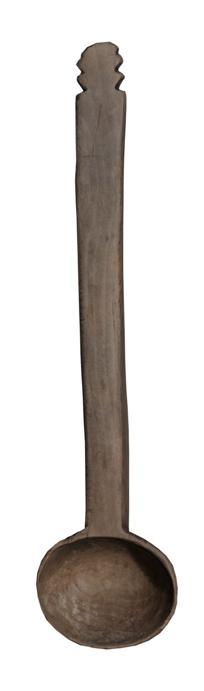 Cuchara de madera tallada, de manufactura sencilla, Presenta un detalle decorativo en el extremo del mango: un tallado simétrico con tres muescas a cada lado, forma una greca escalonada; motivo recurrente en la iconografía Inca.