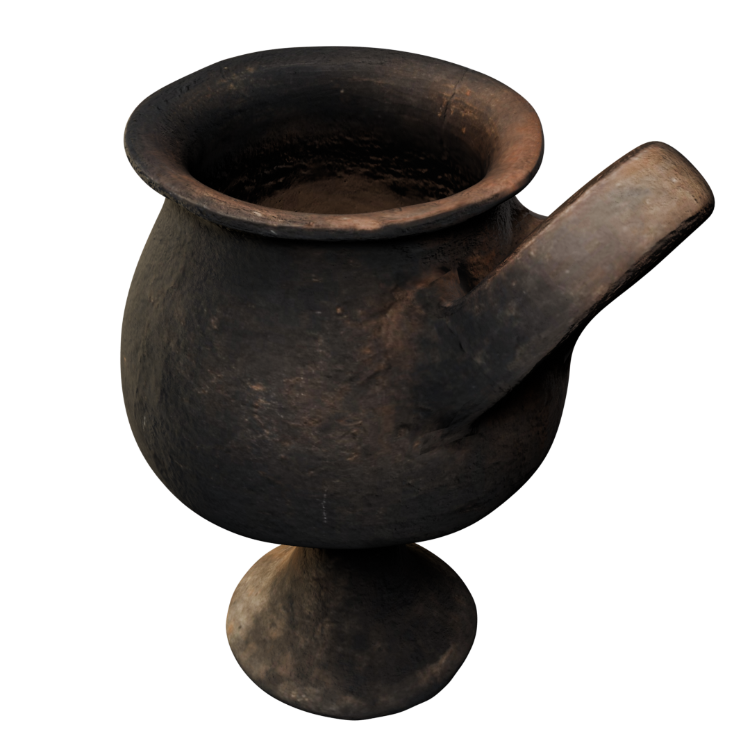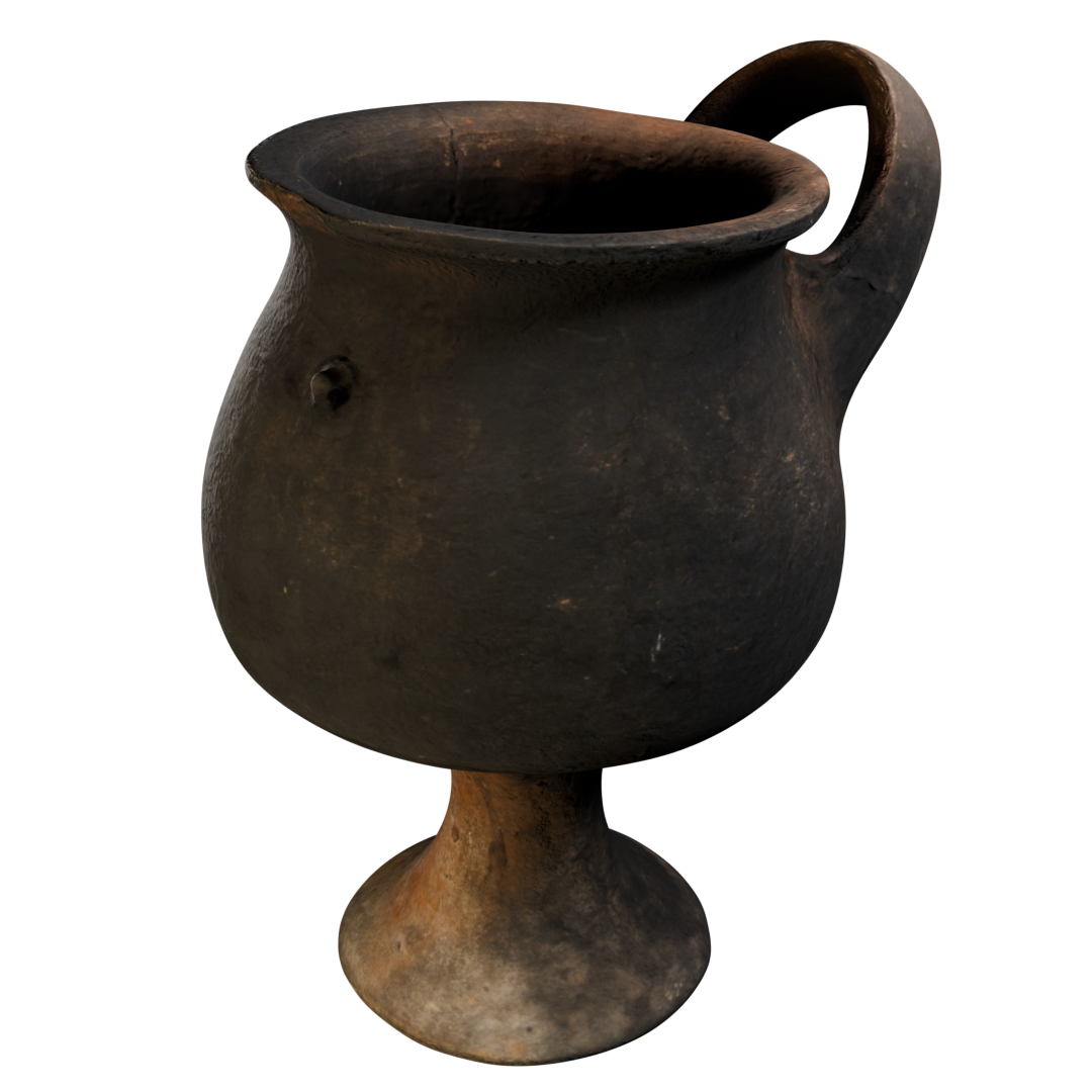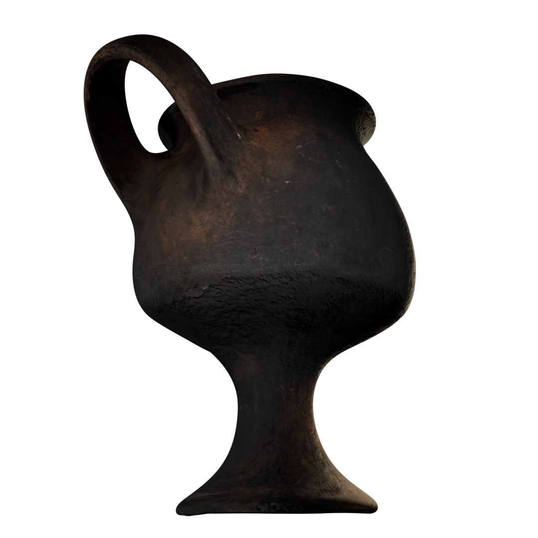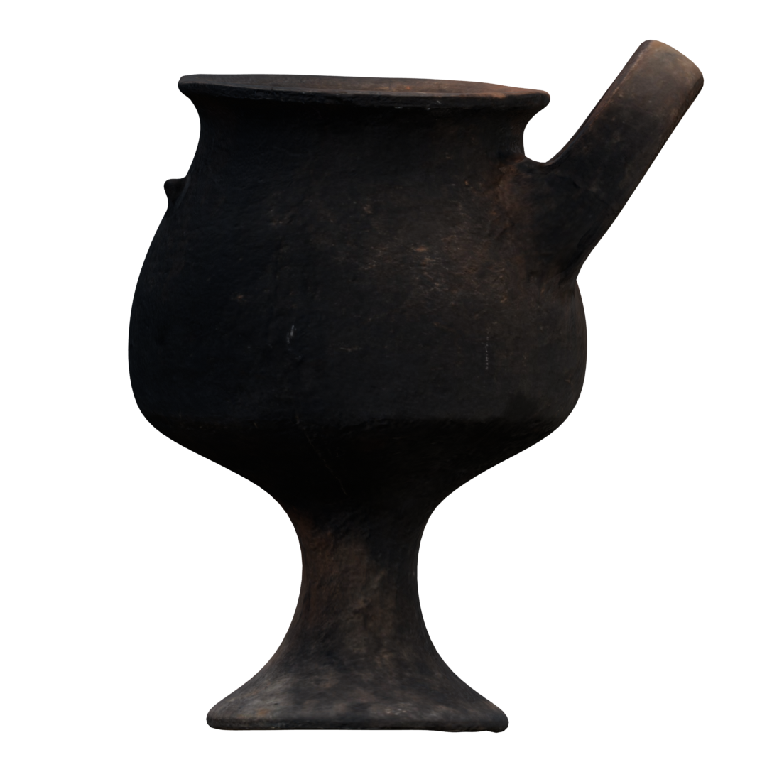 Color café oscuro a negro. Cuerpo redondeado y base en forma de pedestal. Presenta un solo asa grande que sobrepasa el borde superior. Superficie pulida, sin pintura (muestra variaciones de color por el proceso de cocción). Del lado opuesto al asa, destaca un pequeño saliente en el cuerpo, posiblemente decorativo o simbólico.
